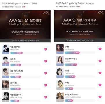 投票期間は10月24日から11月9日までで、男優・女優・男性歌手・女性歌手の4部門で投票が行われます。