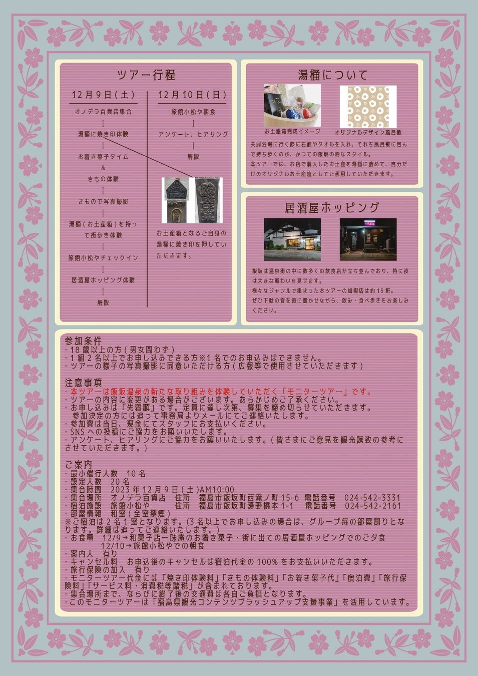 ツアーの詳細や募集人数、価格、集合場所などはチラシを参照してください。