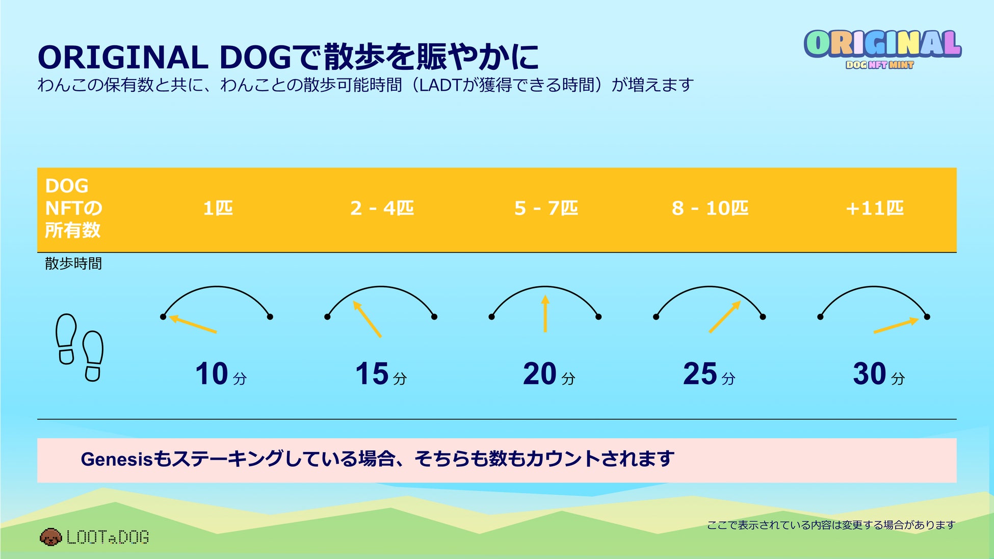- DOG NFTの保有数に応じて散歩可能時間が増加
