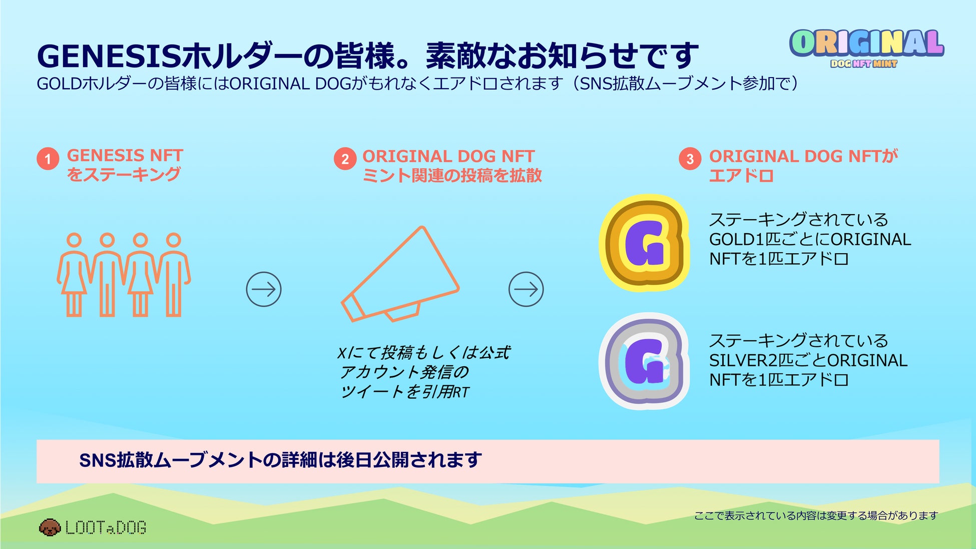 GENESIS DOG NFTをゲーム内でステーキングしたり、ORIGINAL DOG NFTに関する投稿を拡散することで、エアドロップを受け取ることができます。