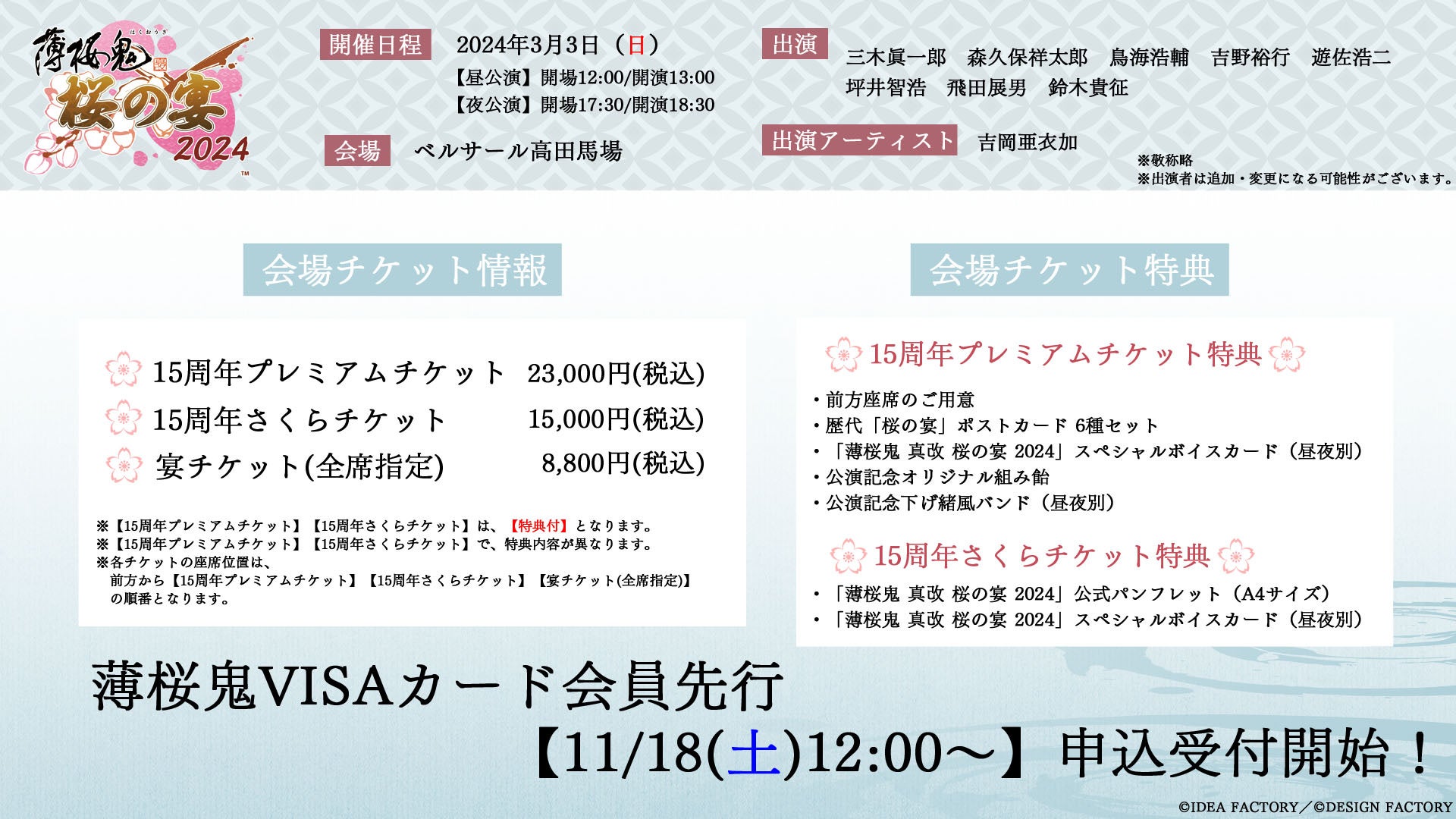 また、明後日11月18日(土)12時からは「薄桜鬼VISAカード」会員限定の最速先行抽選の申し込み受付も開始されます。