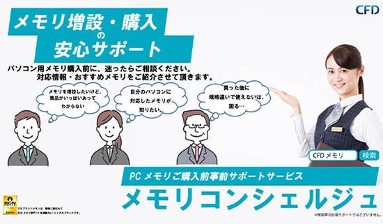 CFD販売のメモリコンシェルジュサービスは、これからPCを組み立てようというお客様や、お持ちのPCにメモリを増設したいというお客様を対象に、お客様のシステムやご要望を元に最適な弊社ブランドメモリをご提案するサービスです。
