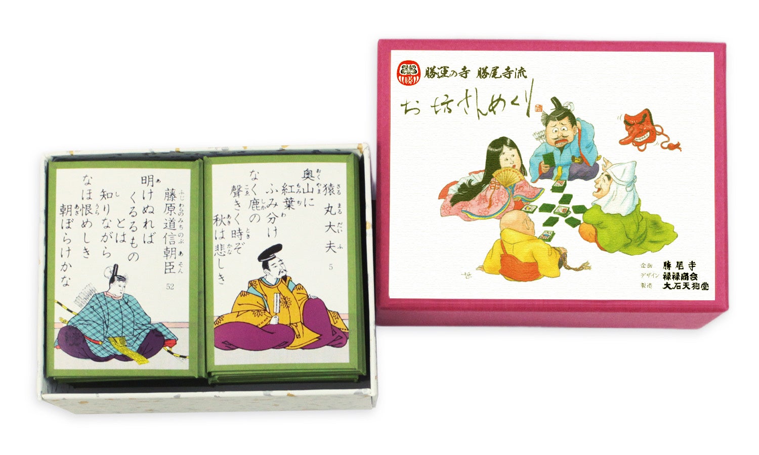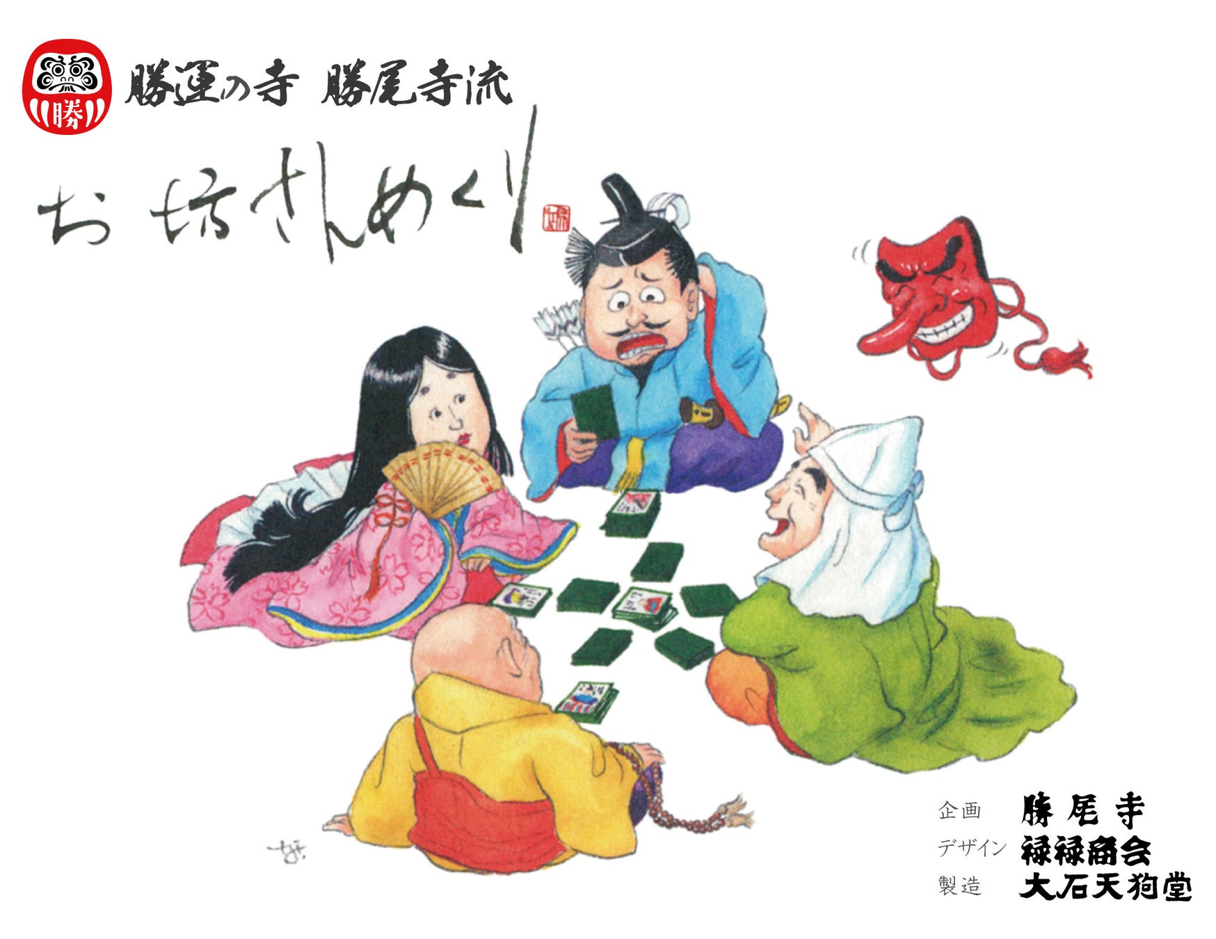 勝尾寺とかるたメーカーの大石天狗堂、禄禄商会の協力により、このゲームが誕生しました。