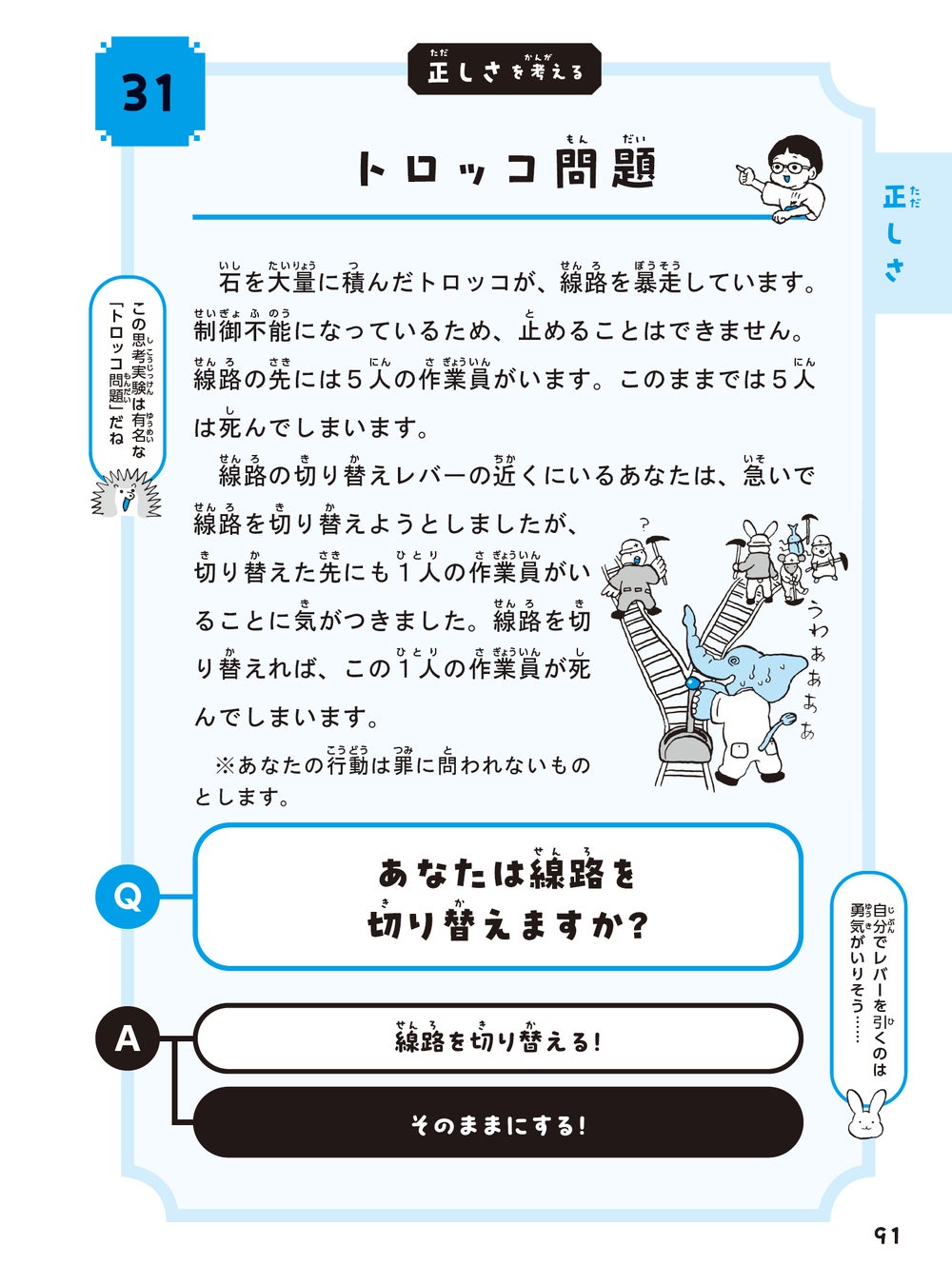 有名な思考実験として、「トロッコ問題」や他の42の実験が収録されています。