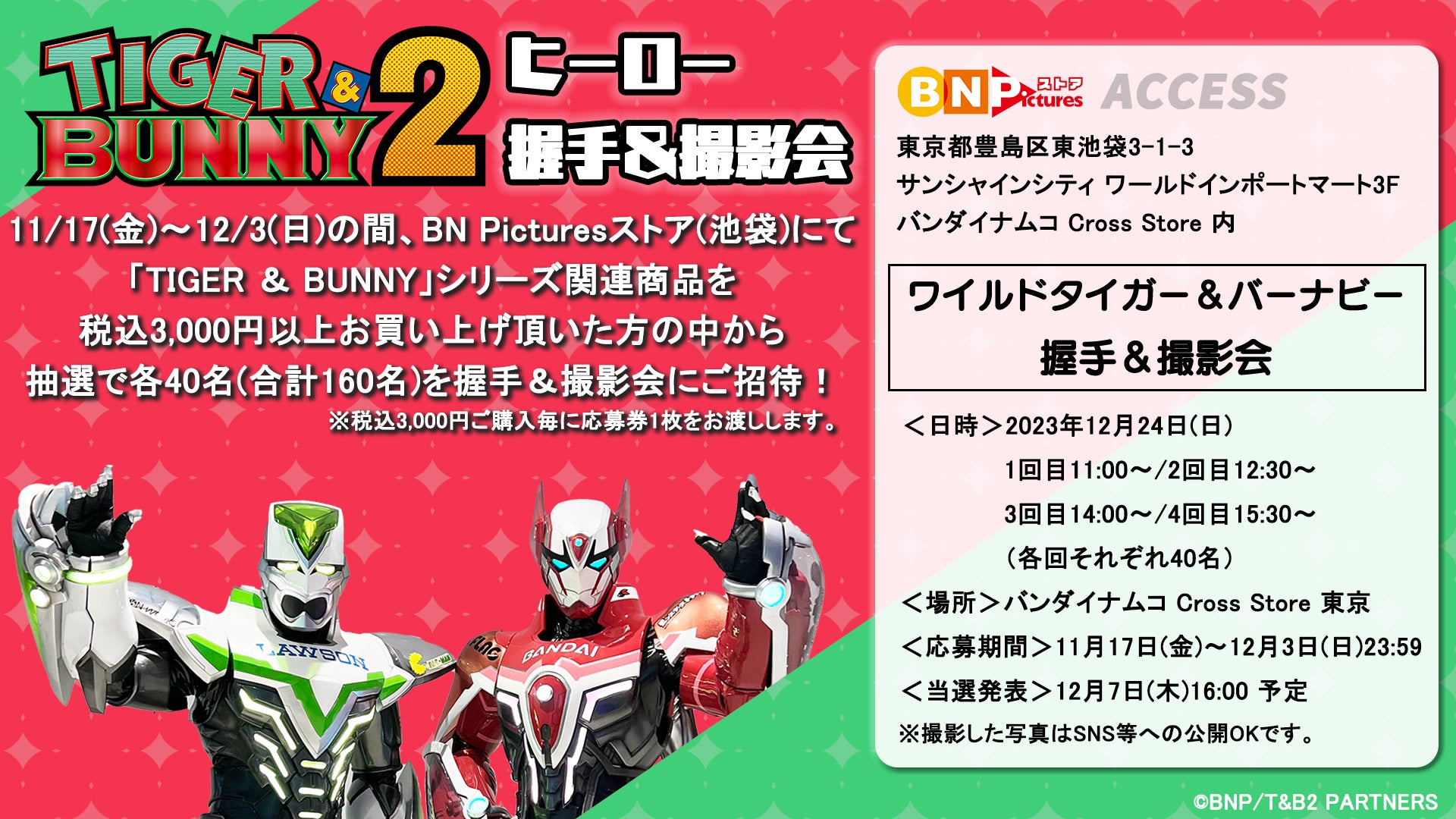 さらに、「TIGER & BUNNY 2」関連商品を税込3,000円以上お買い上げの方には、ワイルドタイガー&バーナビーとの握手&撮影会にご招待します。