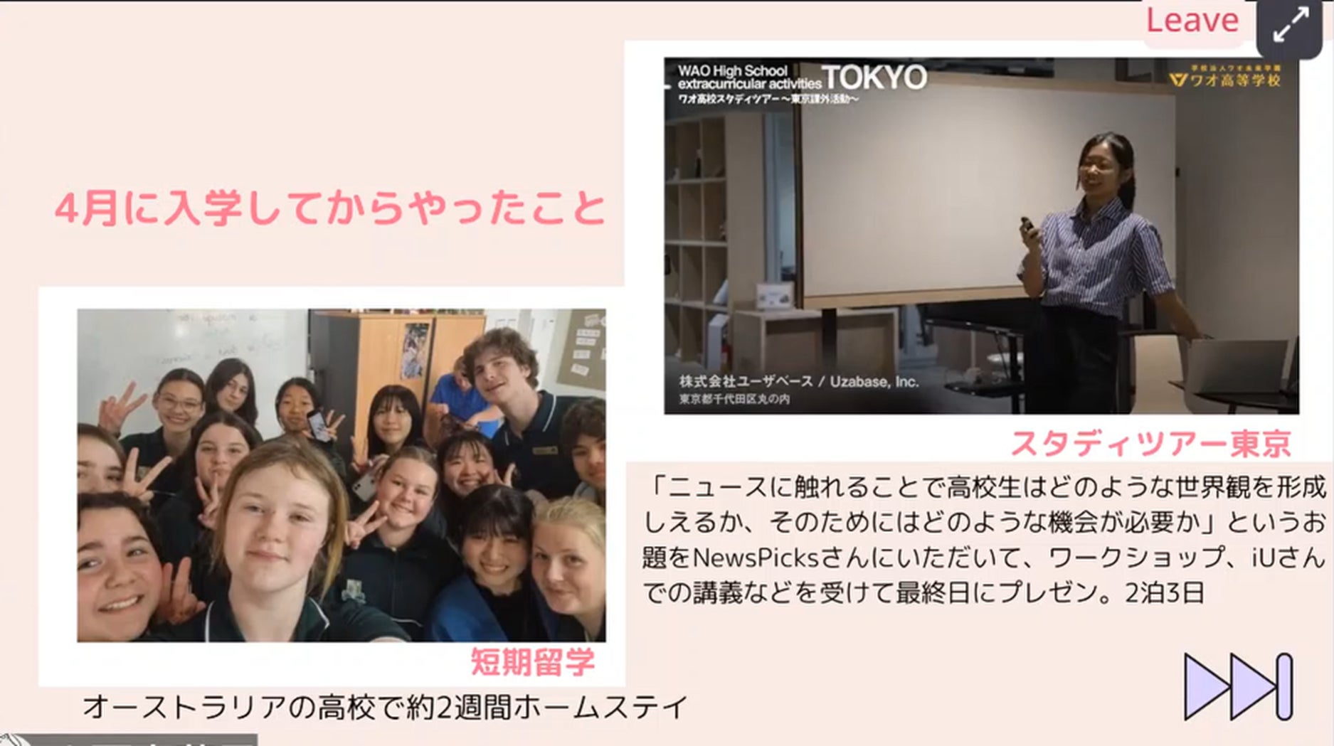 最新の活動報告では、オープンスクールで行われた「ワオ高生が先生になるプレゼンショー第四弾」が紹介されました。