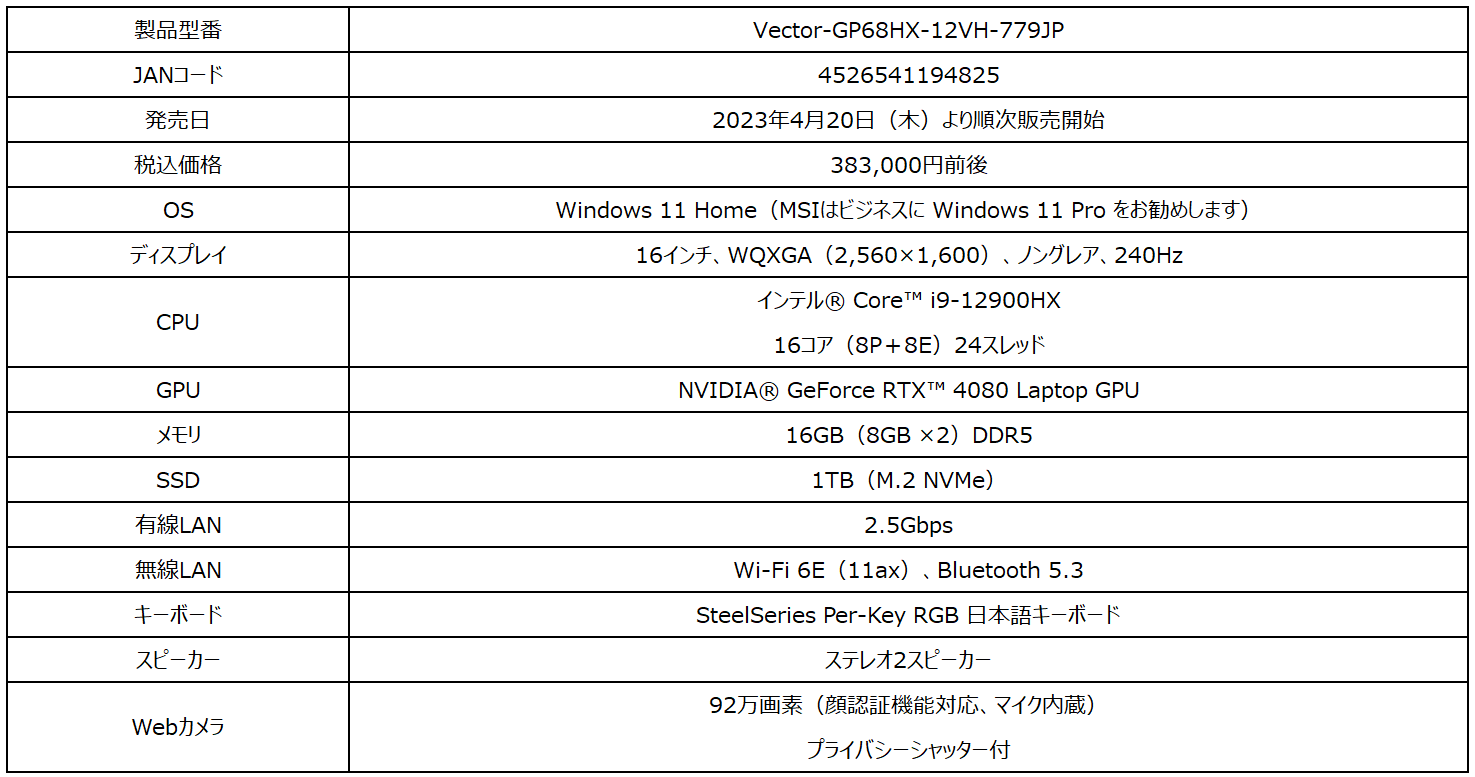 この度、エムエスアイコンピュータージャパン株式会社は、「Core™ i9-12900HX」と「GeForce RTX™ 4080 Laptop GPU」を搭載し、プロeスポーツプレイヤー向けの圧倒的な超高性能を備えたウルトラハイスペックゲーミングノートPC「Vector GP68HX 12V」シリーズの店頭販売モデル「Vector-GP68HX-12VH-779JP」を2023年4月20日(木)より発売いたします。