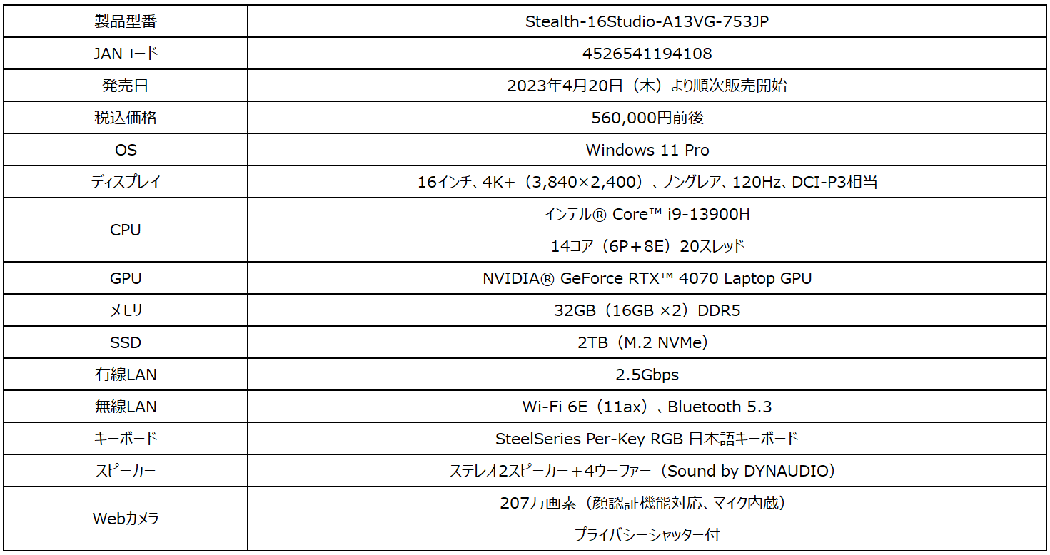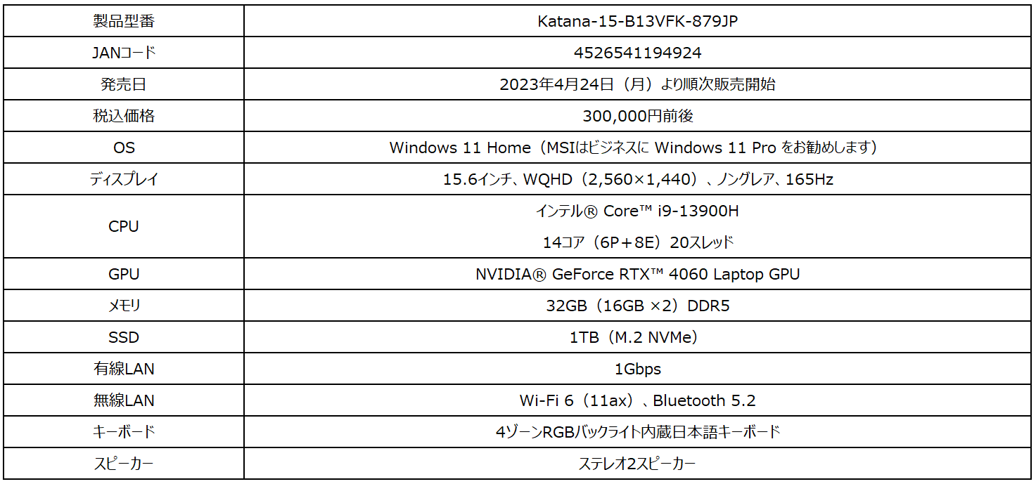 また、同社は「Stealth-16Studio-A13VG-753JP」を2023年4月20日より、「Katana-15-B13VFK-879JP」を2023年4月24日より順次販売開始する。