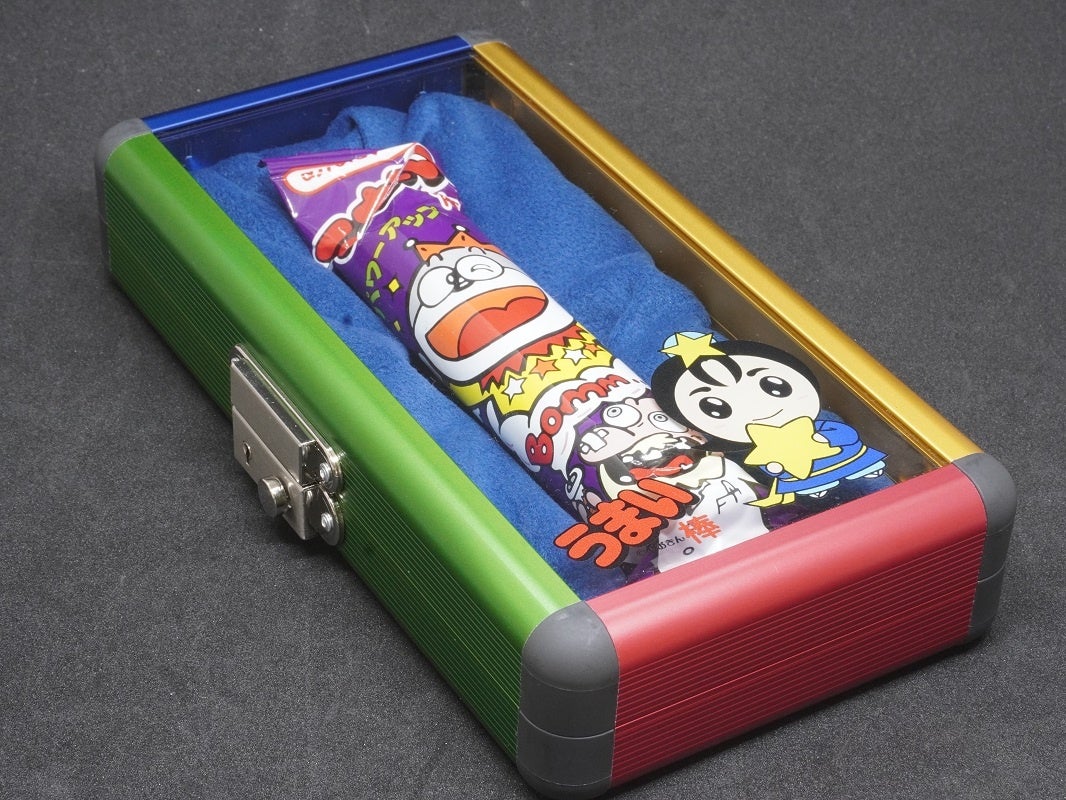 - うまい棒専用でアクリルとアルミニウムで作られており、地元の企業との協力によって実現