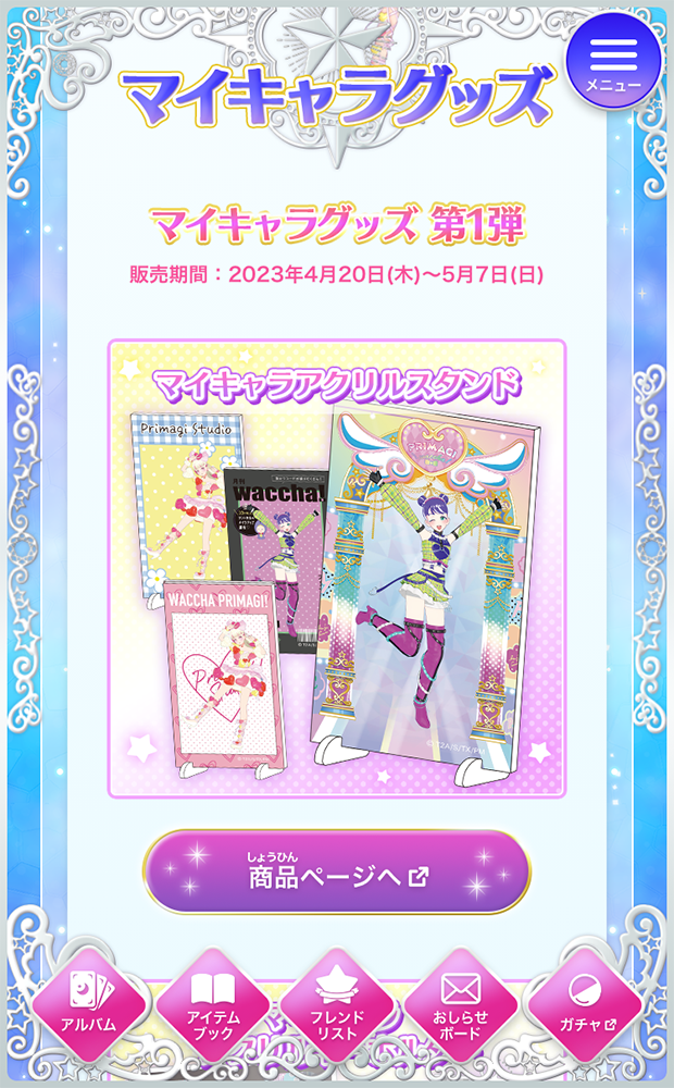 ワッチャプリマジ!スタジオ、プリマジプロフカード、マイキャラグッズショップ、アクリルスタンド、アクリルキーホルダー、Tシャツ