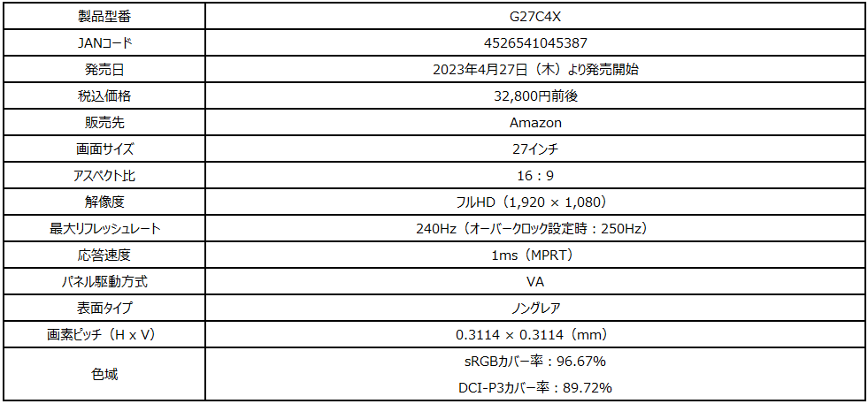 高い没入感を体験可能な湾曲パネル搭載27インチゲーミングモニター リフレッシュレート250Hz・応答速度1msのハイスペックモデル 「G27C4X」発売