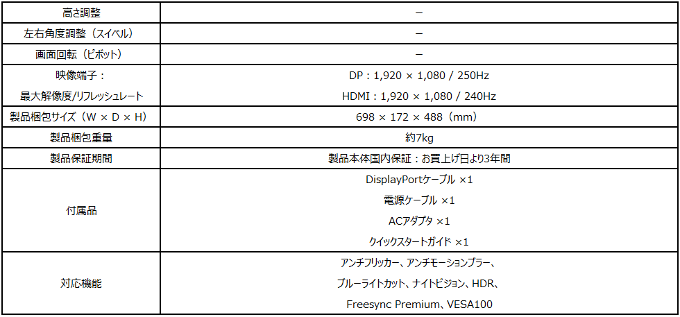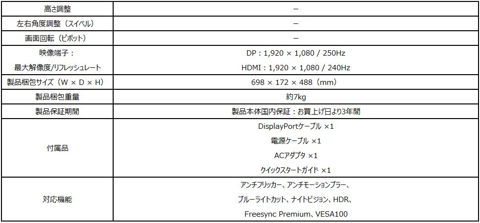 フルHD解像度、リフレッシュレート250Hz、応答速度1msの高スペックで、FreeSync Premium、HDR、ナイトビジョン、アンチフリッカー、ブルーライトカット機能を搭載。