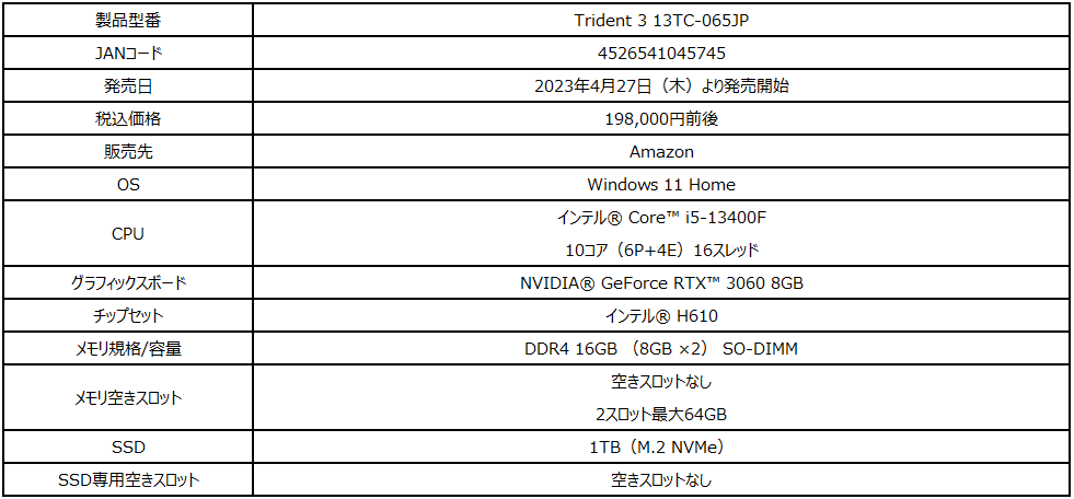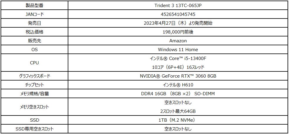 - 同日には高性能冷却性コンパクトの3要素を実現したゲーミングデスクトップPC「Trident 3 13TC065JP」も発売