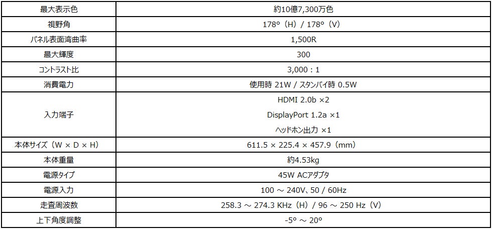 - 湾曲パネル搭載、フルHD解像度、リフレッシュレート250Hz、応答速度1ms、FreeSync Premium、HDR、ナイトビジョン、アンチフリッカー、ブルーライトカット機能、高性能、冷却性、コンパクト