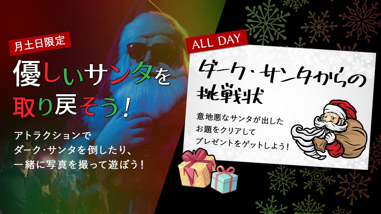 この参加型イベントでは、ちょっぴりダークなサンタクロースに挑戦し、ミッションをクリアするアクティビティやクリスマス限定のフォトスポットなどを楽しむことができます。