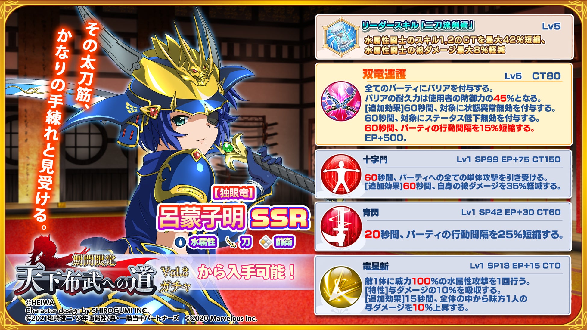 限定衣装の「呂蒙子明」が登場し、コラボ限定闘士「【独眼竜】呂蒙子明(SSR)」が排出されるガチャも開催中です。