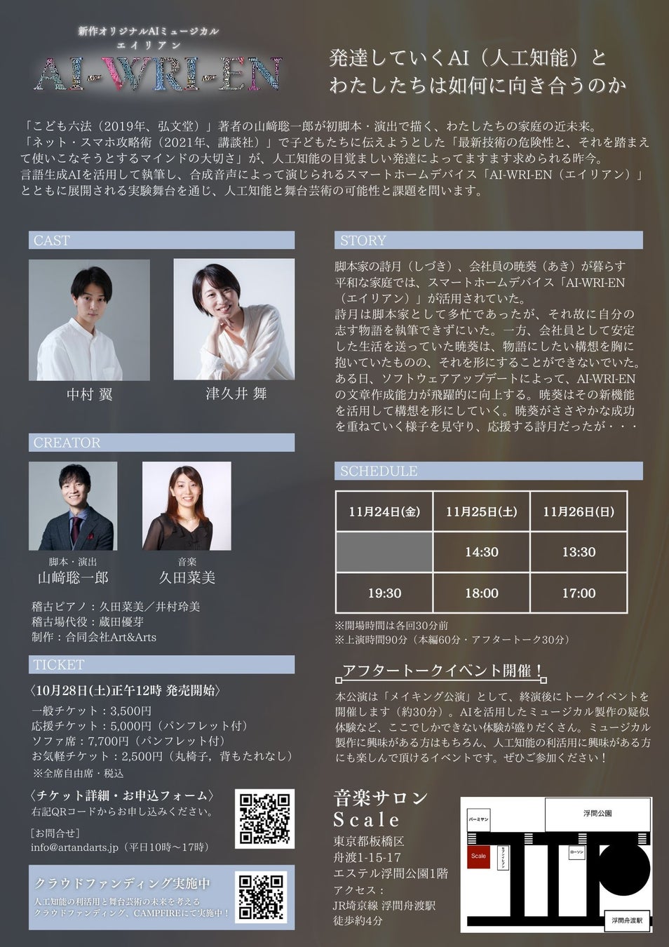 2023年11月24日から、JR埼京線浮間舟渡駅から徒歩4分の「音楽サロンScale」で、新作オリジナルミュージカル「AI-WRI-EN(エイリアン)」のメイキング公演が行われます。