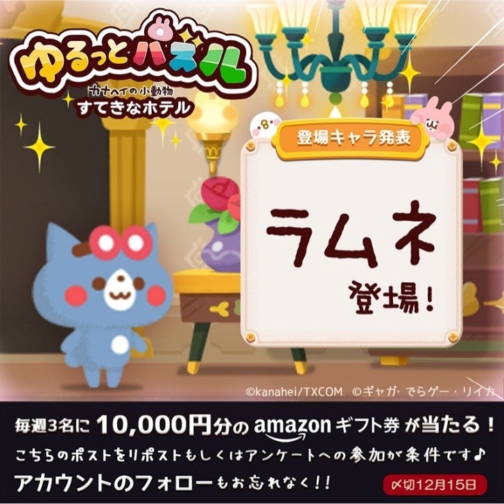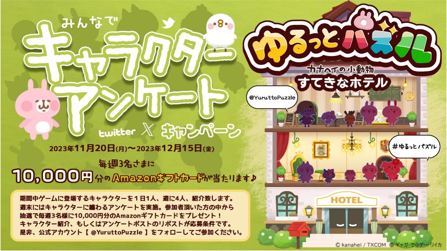 株式会社でらゲーは、Android/iOS向けの新作ゲームアプリ『ゆるっとパズル – カナヘイの小動物 すてきなホテル』の公式X(旧Twitter)で、「みんなでキャラクターアンケートキャンペーン」を開催します。