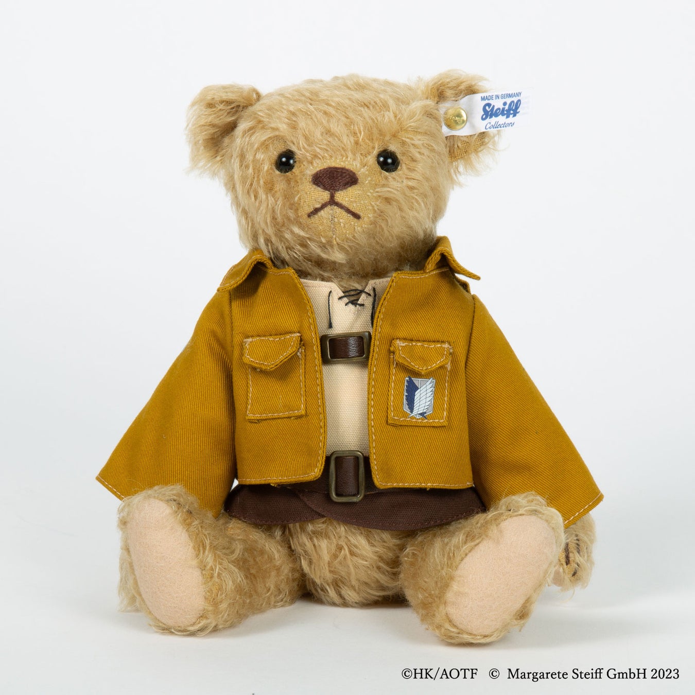 エレン・イェーガーの服を着たテディベアで、マントには10周年ロゴのピンが付いています。