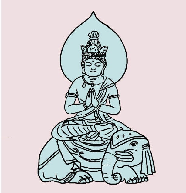 普賢菩薩さまの下にはかわいい白象が描かれており、半田カメラさんのイラストを元にしています。