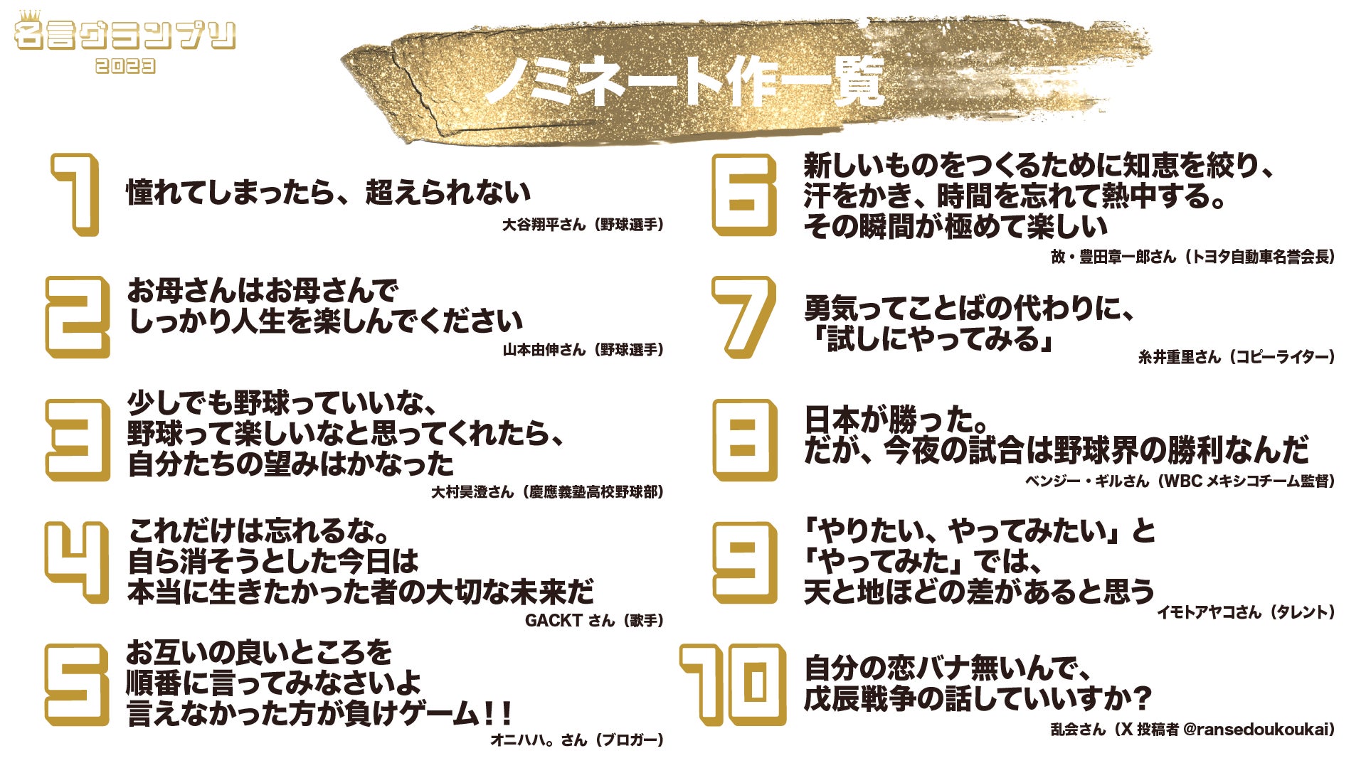 - 「名言グランプリ 2023」では、10作品がノミネートされた