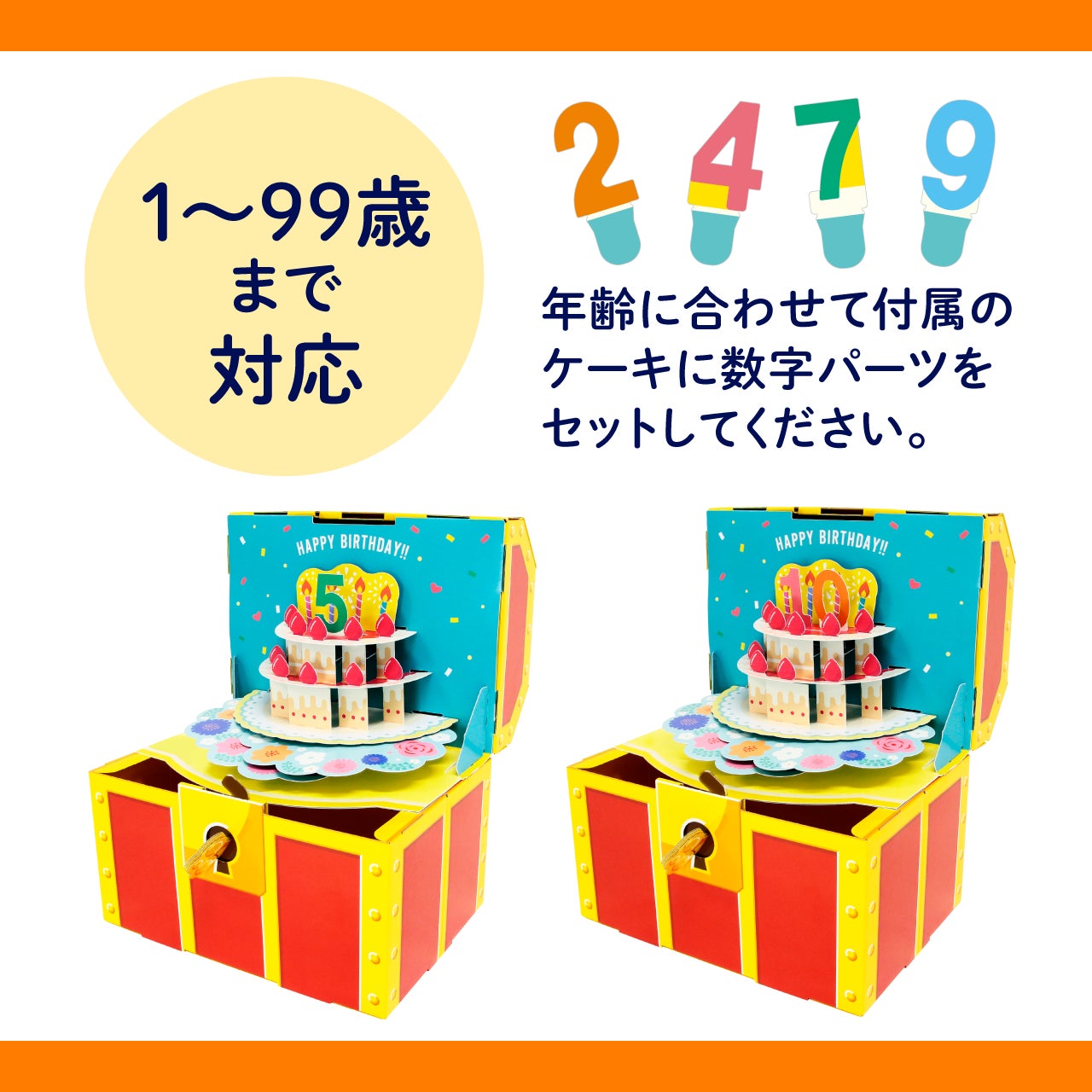 - 宝箱を開けると、飛び出すシートのケーキやアルファベットが立ち上がる