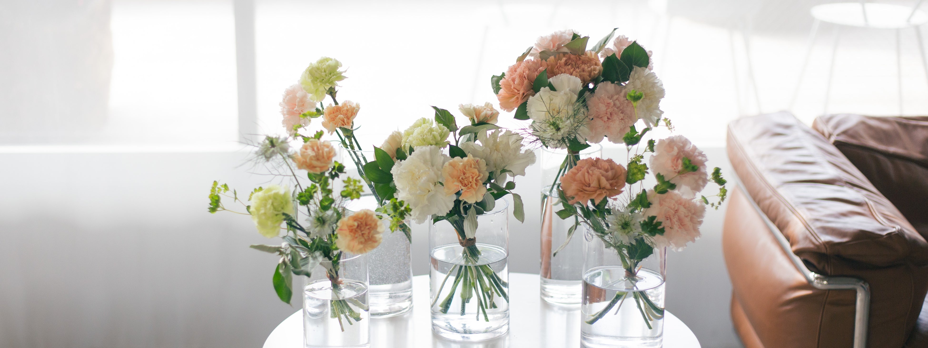 ・カーネーションの品種、合わせる小花やグリーンはその時々のおすすめを、おまかせで束ねています。