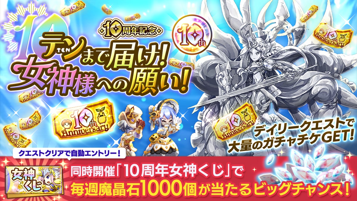 - 10周年、イベント、ガチャ、スキルレベル、コンテンツ、テンまで届け!女神様への願い!、ウェルカム&カムバックキャンペーン、新規プレイヤー、復帰プレイヤー、ログレス王国