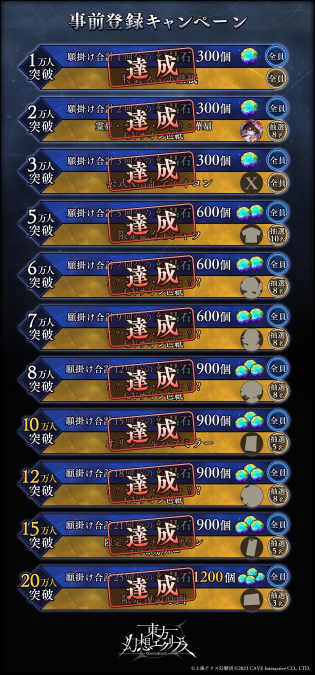 事前登録キャンペーンの登録者数が20万人を達成したため、ゲームをダウンロードしてログインした全てのユーザーに「幻晶石7500個」がプレゼントされます。