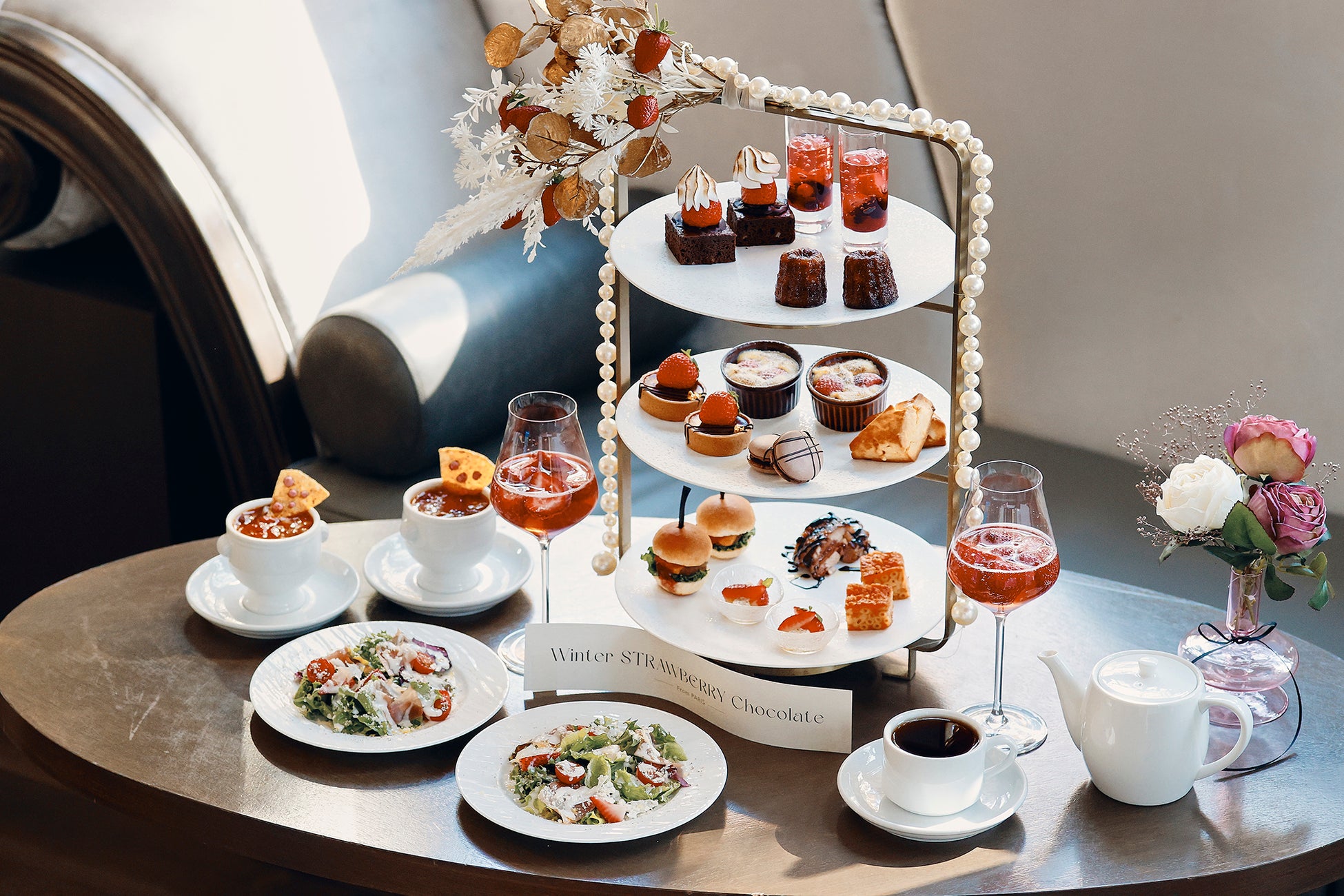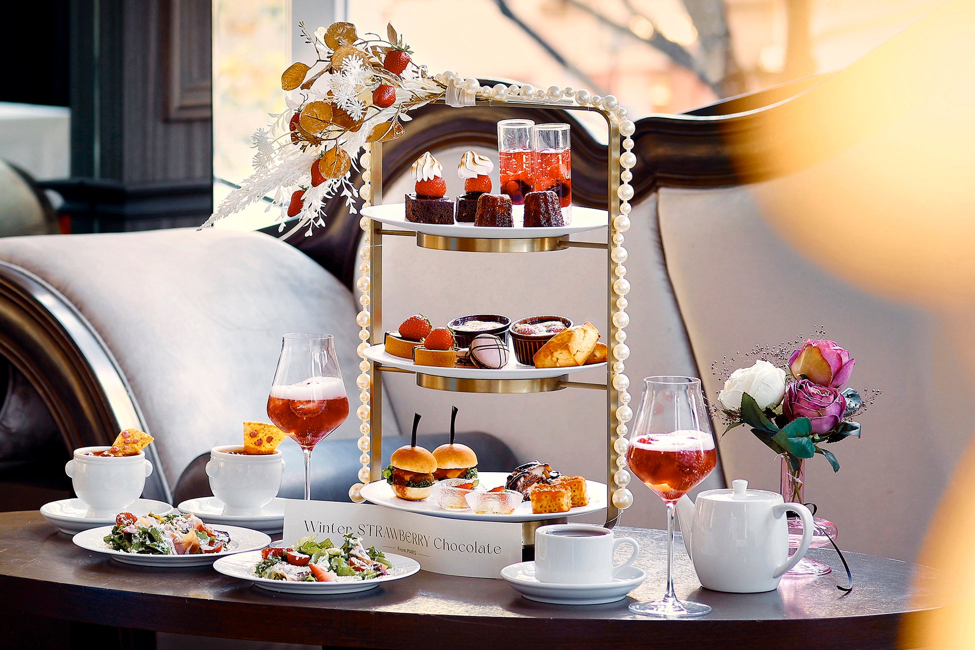 ぜひ、ハイエンドなインテリアが揃うラグジュアリーな空間で、旬の苺とチョコレートを存分に味わいながら、エレガントなティータイムをお楽しみください。