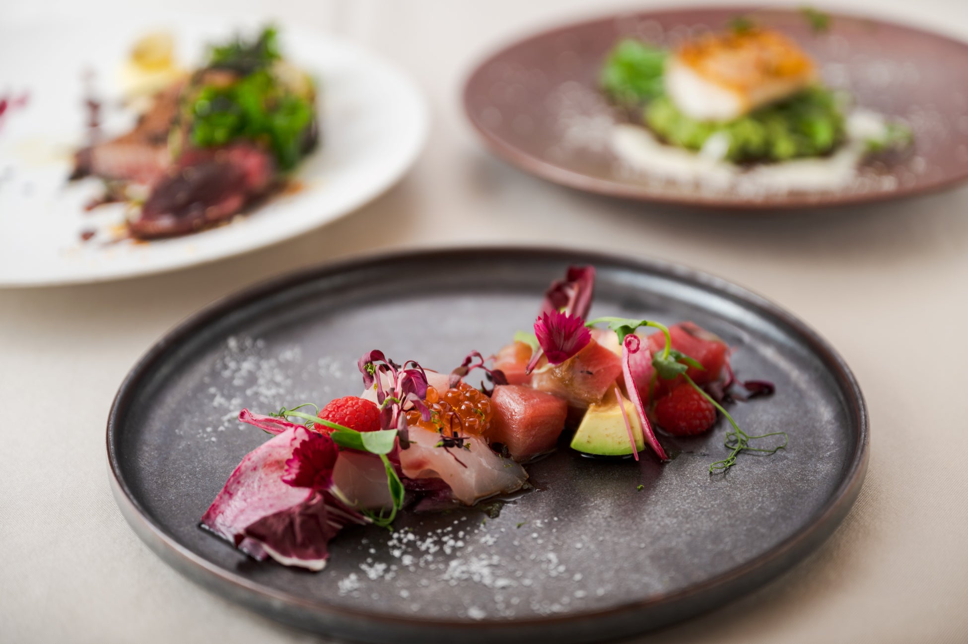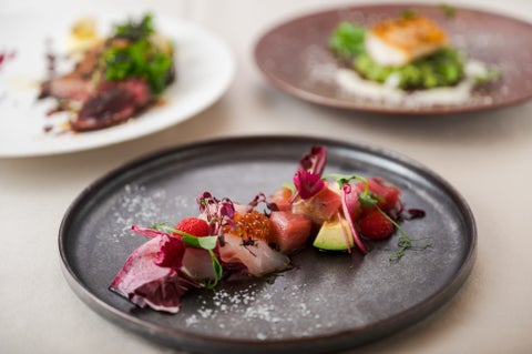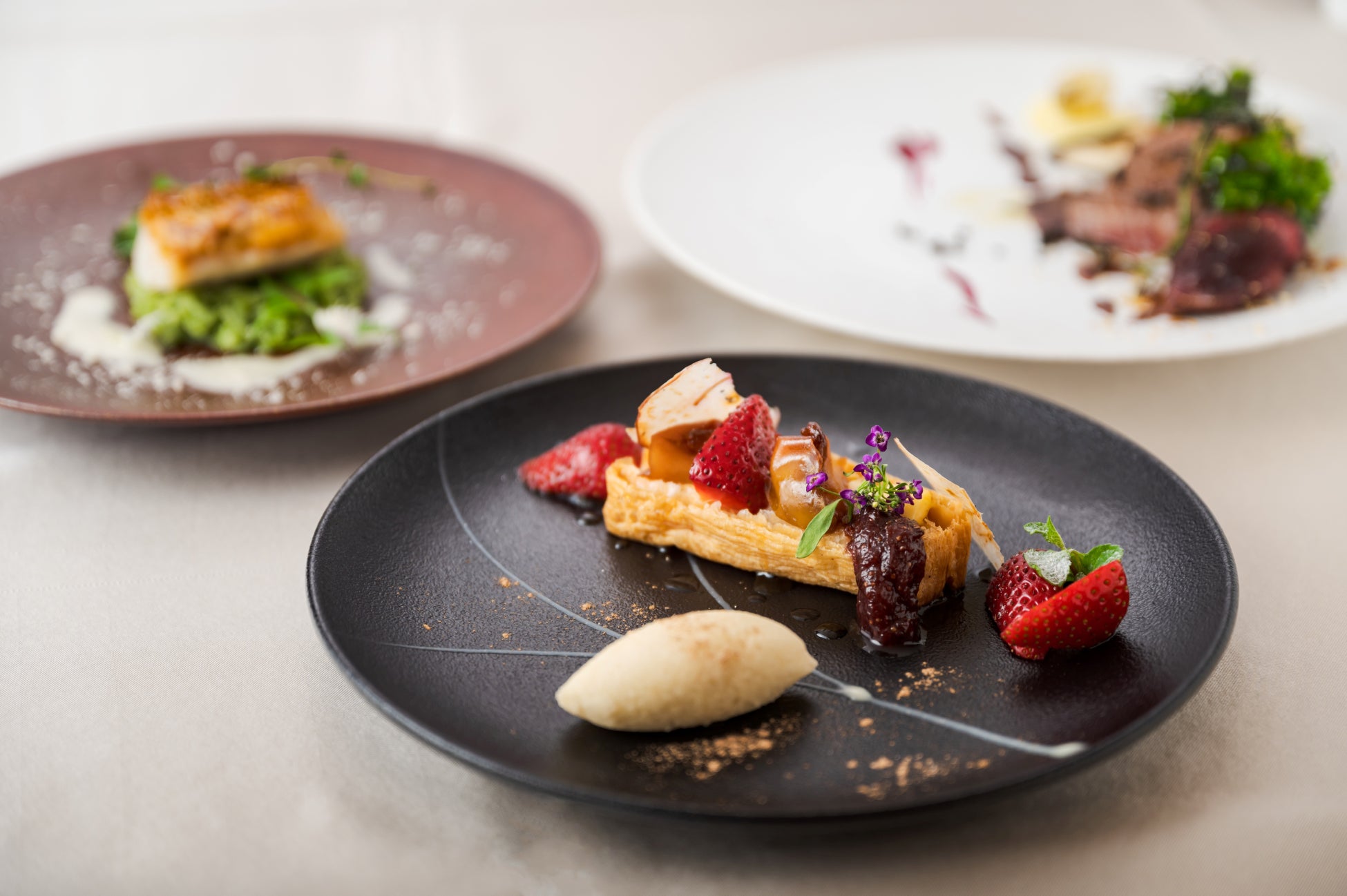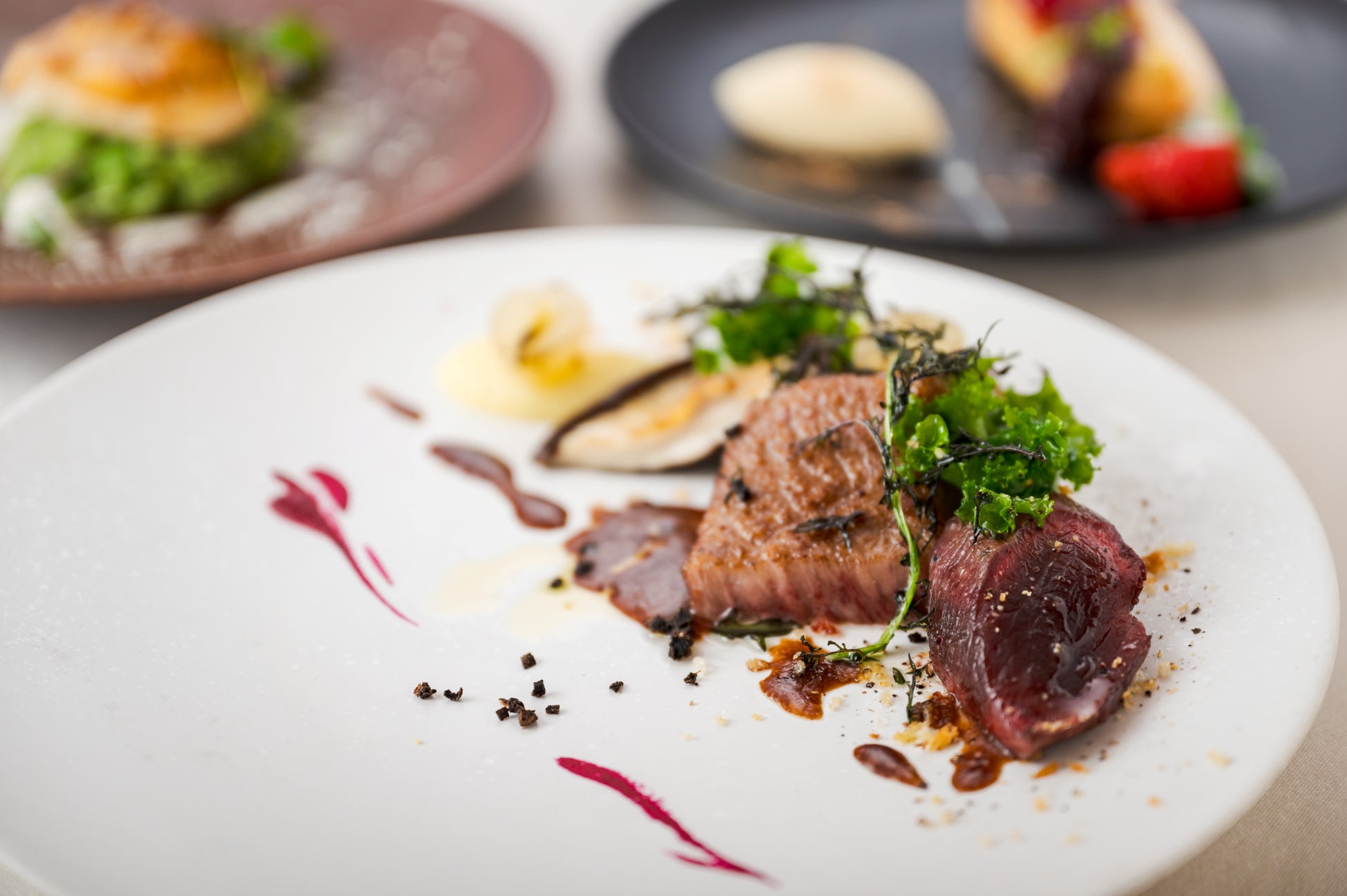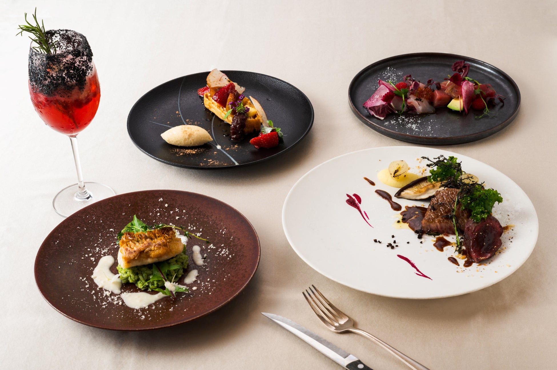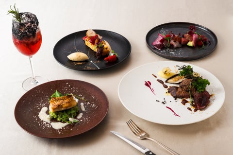 - 和牛とクランベリーのスライダー、牛ヒレのチャコールグリル、九州産のハタ、宮崎牛と延岡鹿肉のチャコールグリル