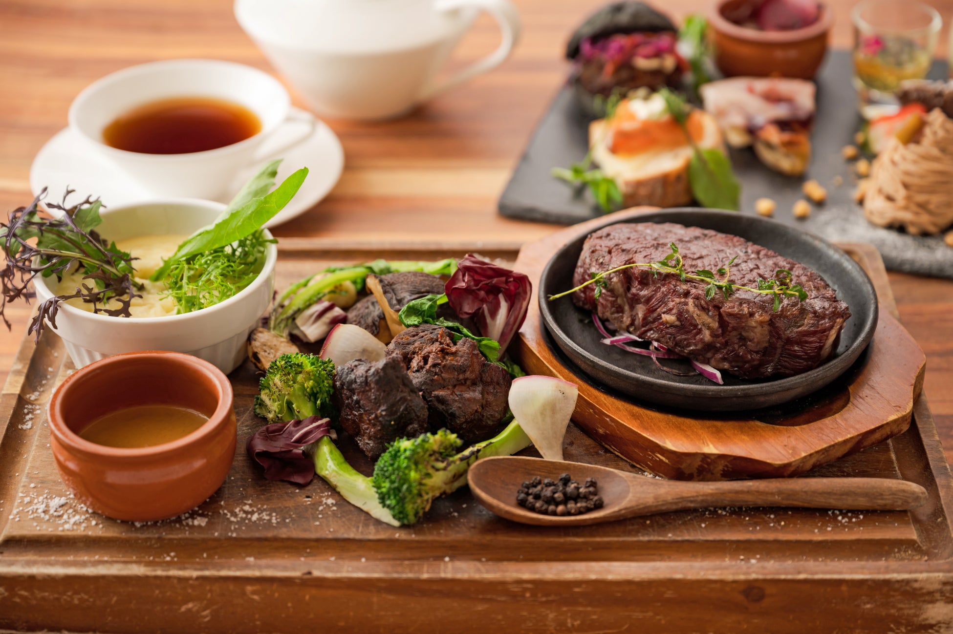 「肉×アフタヌーンティー」は、和牛とクランベリーのスライダーや牛ヒレのチャコールグリルなど、メインの肉料理に加えてスイートポテトのパンナコッタなどのデザートも楽しめるプランです。