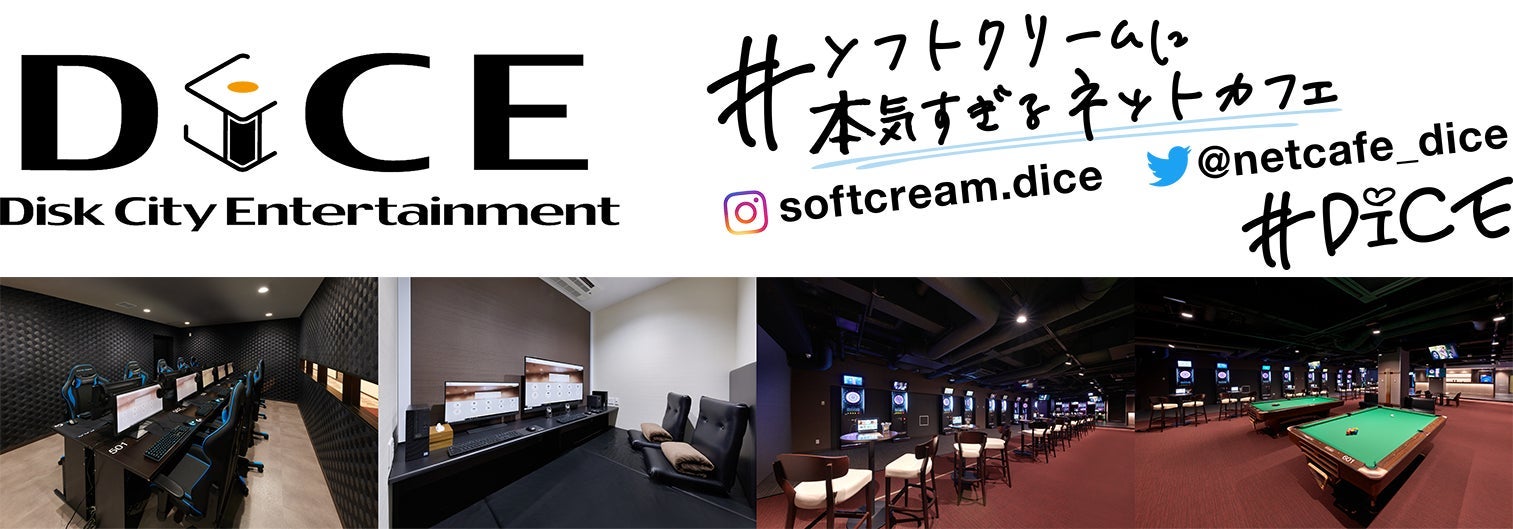 DiCEは高級感と清潔感のあるインターネットカフェで、ソフトクリームやアミューズメントコンテンツも楽しめます。