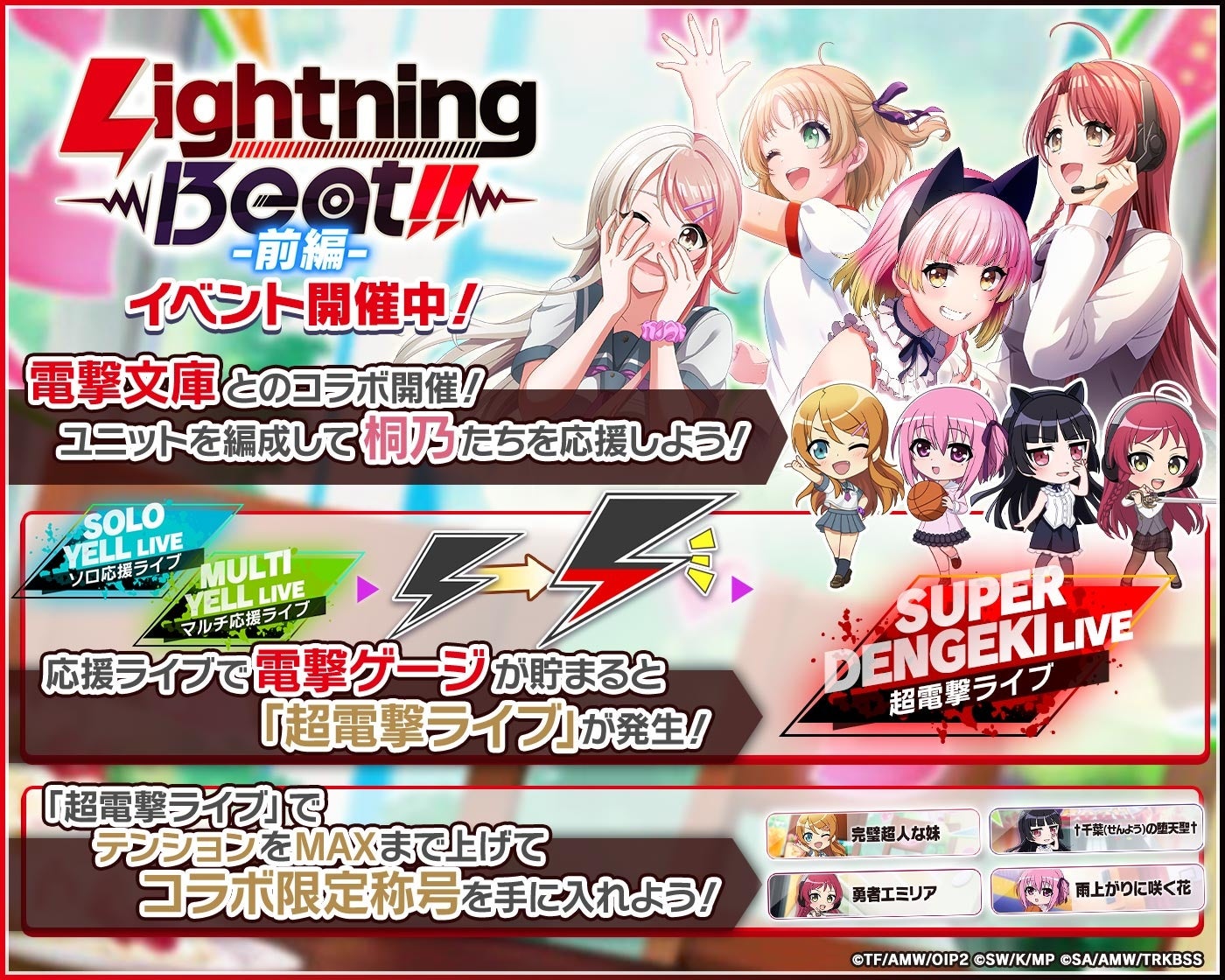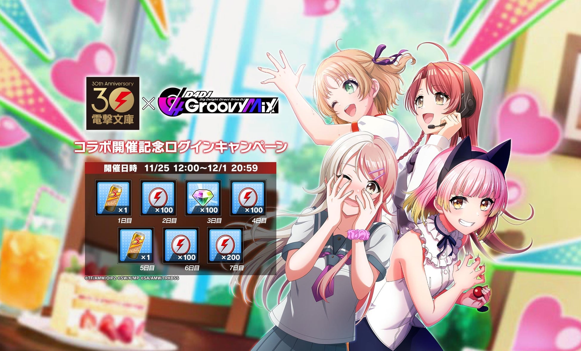 - 株式会社ブシロードと株式会社DONUTSが共同開発したスマートフォン向けリズムゲーム「D4DJ Groovy Mix」にて、「電撃文庫」とのコラボイベント&ガチャ「Lightning Beat!!前編」を開催中