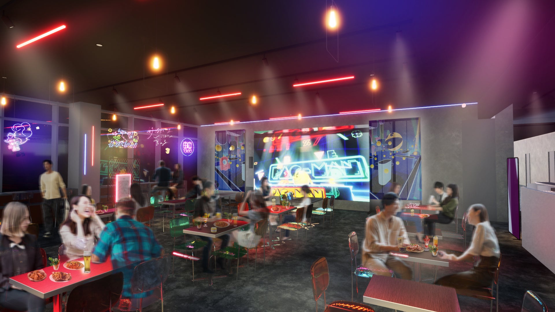 アミューズメント、フード、イベントなどが融合する当施設には、インタラクティブバーチャルパフォーマンスシステム「BanaDIVE™AX」が導入された飲食エリア『ASOBINOTES』(アソビノオト)が設けられています。大型LEDスクリーンで「DJパックマン」などキャラクターDJのパフォーマンスを楽しみながら、飲食することができます。
