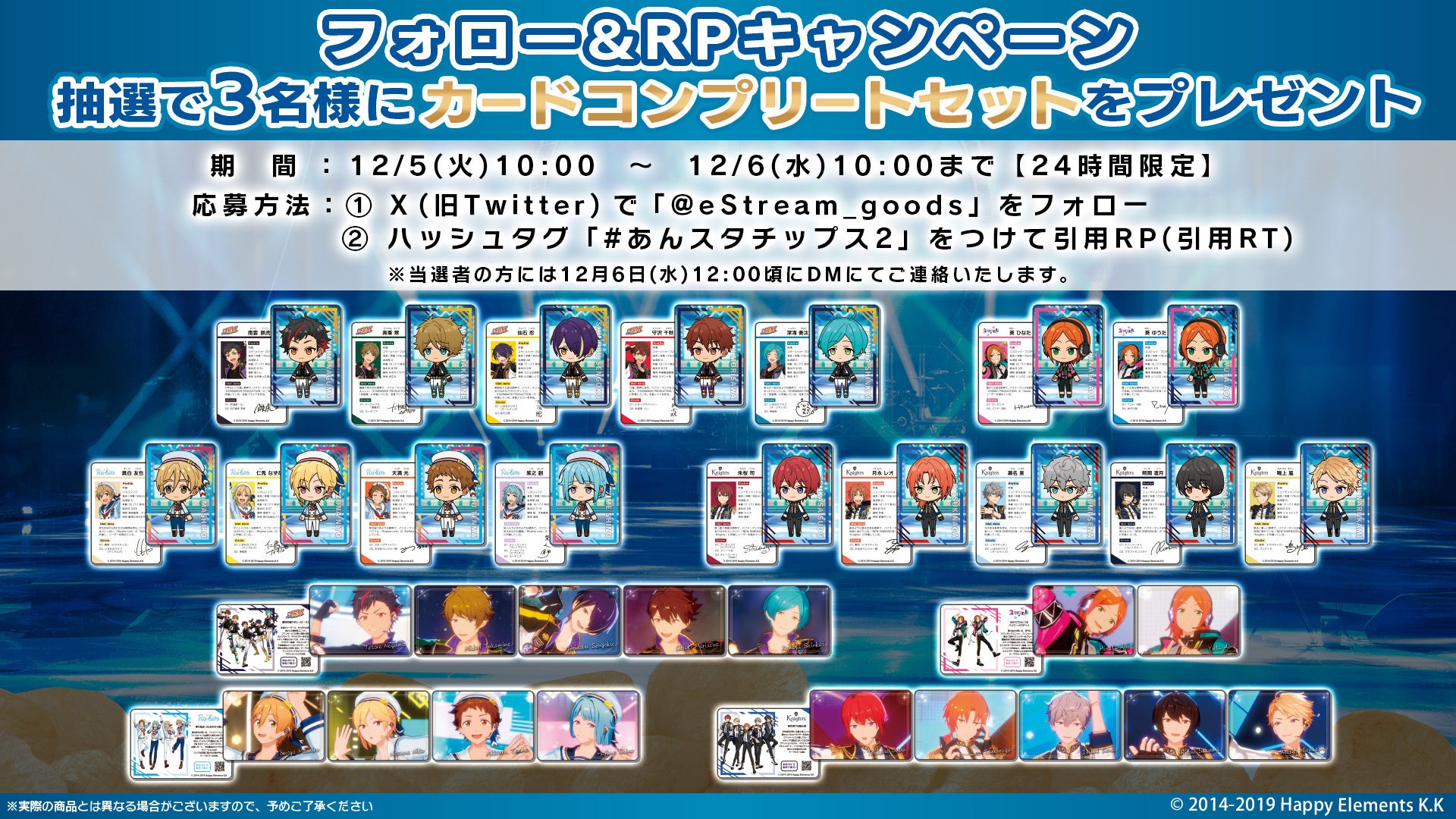 eStreamは、2023年12月5日から人気スマホゲーム「あんさんぶるスターズ!!」のオリジナルカード付き「あんさんぶるスターズ!!チップス vol.2」を販売します。