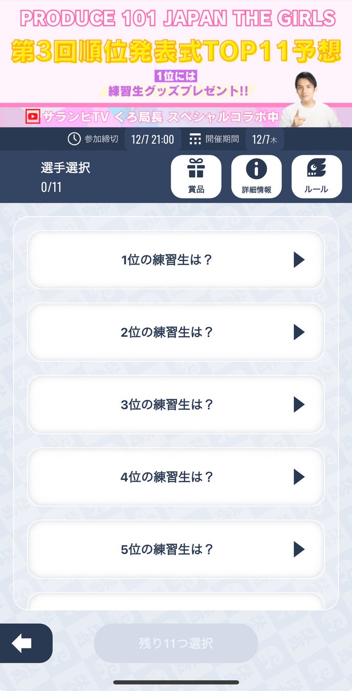 予想期間は課題曲バトルが11月30日まで、順位発表は12月6日までです。