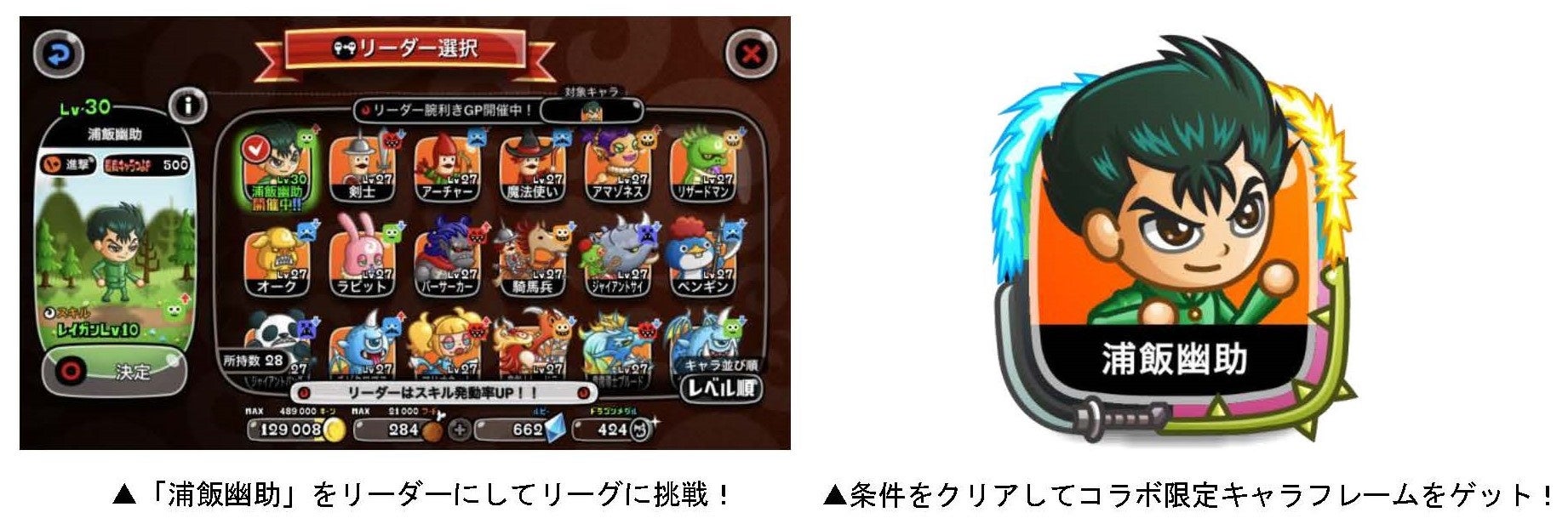 コラボ限定キャラ「浦飯幽助」をリーダーにしてリーグに挑む「リーダー腕利きGP」を開催いたします。バトルに勝利してより多くの“キャラフレP”を獲得したランキング上位者や条件を達成した方には、コラボ限定“キャラフレーム”が贈られます。