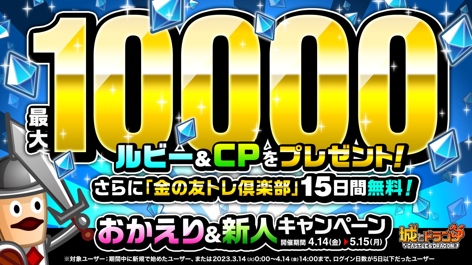 4月14日(金)より、対象ユーザーに最大10,000ルビーや金の友トレ倶楽部などが贈られる「おかえり&新人キャンペーン」が開催いたします。