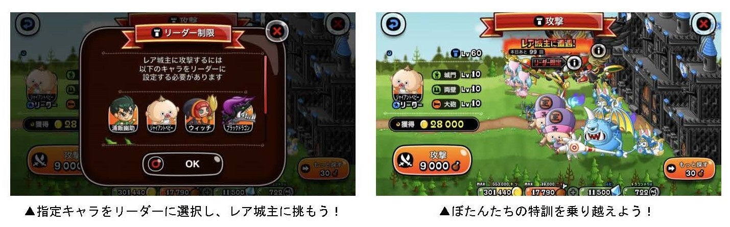 プレイヤーの城に“戸愚呂”率いる『城ドラ』のキャラたちが攻めてくる!「襲来イベント」は、あらかじめ設定しておいた「防衛作戦」で城を守り、見事敵を撃退すると“ルビー”や“ドラゴンメダル”などの報酬を獲得することができます。襲来に備えて防衛隊列を整えましょう!