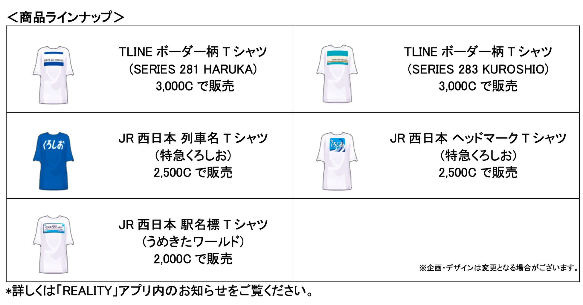 この度、2023年3月18日(土)に開業した「大阪駅(うめきたエリア)」のバーチャル空間である「バーチャル大阪駅 うめきたワールド」がスマートフォン向けメタバース「REALITY」上で3月8日(水)から先行して開業(公開)されたことを記念して、大阪駅(うめきたエリア)に実際に発着する「関空特急はるか」や「特急くろしお」の特急列車名やトレインマークをあしらったオリジナルデザインのアバターTシャツアイテムが期間限定で販売されます。