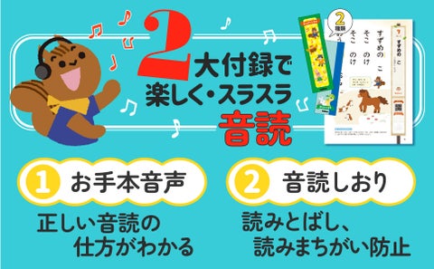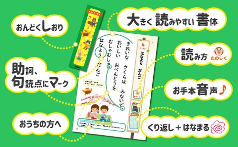 この本は、お子さまの音読をサポートするために、お手本音声や読みやすい紙面、音読しおりなどの工夫が施されています。