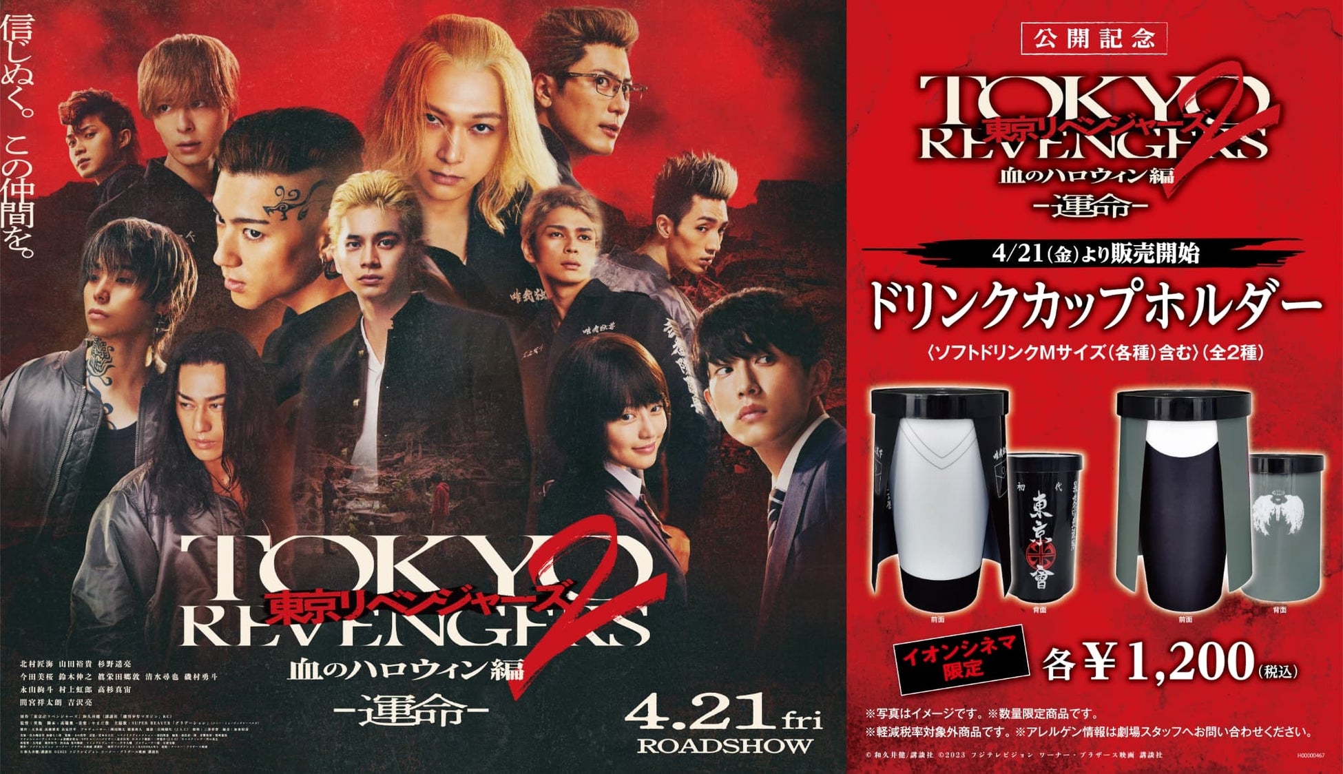 - 映画『東京リベンジャーズ2 血のハロウィン編 運命』の劇場公開を記念して、イオンシネマ全劇場の飲食売店で、特攻服をビジュアルに用いたドリンクカップホルダーを販売する。