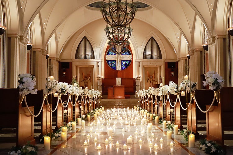 大理石のバージンロードにキャンドルが灯り、幻想的な雰囲気の中で聖歌隊とパイプオルガンが讃美歌を奏でます。