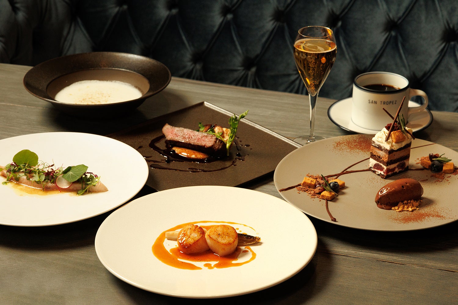- ブリのミキュイと村上農園ハーブのサラダ、柚子ヴィネグレット、トピナンブールのポタージュ、トリュフの香り、北海道産ホタテのポワレ、大三島みかんワイン、ビガラードソース、オーストラリア産短角牛のサーロインステーキ、赤ワインソース、生黒粒コショウ、フォレノワールの珈琲または紅茶、シャトージュン×サントロペ、ナイアガラスパークリングワイン、フォレノワール、ヨーロッパの伝統的なチョコレートとチェリーのケーキ