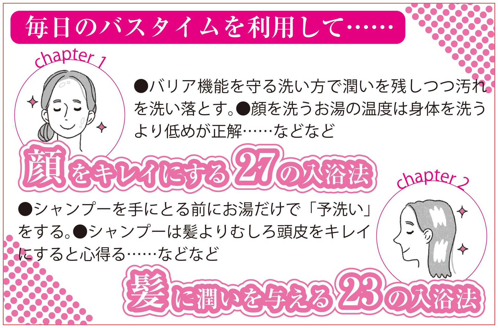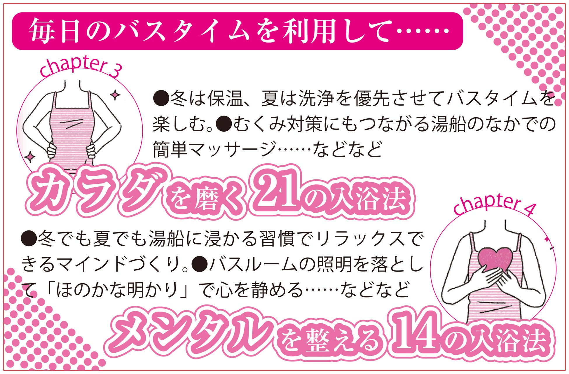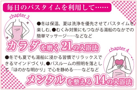 - バスタイムでキレイになる方法やリラックスするコツを紹介、心を癒す時間でもあります。