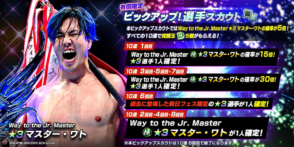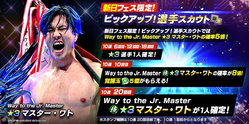 株式会社ブシロードと株式会社ドリコムが共同開発したスマートフォンゲームアプリ『新日本プロレスSTRONG SPIRITS』(以下、新日SS)に、新たな育成選手として★3「[Way to the Jr. Master]マスター・ワト」と、新たなSSRパートナーとしてSSR「[連合帝国の盟主]ウィル・オスプレイ」が追加されました。