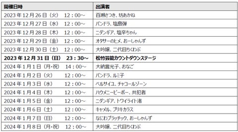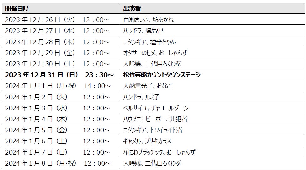 - 特に注目は、松竹芸能カウントダウンステージで、12月31日の23:30から開催される。