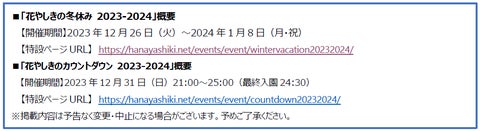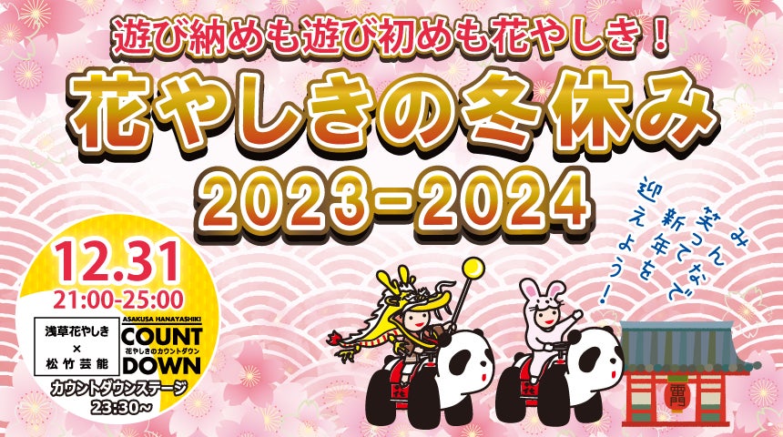 - 松竹芸能スペシャルステージ、松竹芸能カウントダウンステージ、駆け抜けて軽トラ、ミクミクサイダー、イッタレ ヤッタレチャンピオン大会、稼働アトラクション、ミニ年越しそば、公式サイト、浅草花やしき、年末年始の営業時間、入園料