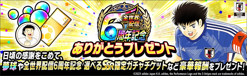 KLab株式会社が提供するスマートフォン向けの対戦型サッカーシミュレーションゲーム『キャプテン翼 ~たたかえドリームチーム~』は、全世界配信6周年を記念して12月1日から「全世界配信6周年記念キャンペーン」を開催します。